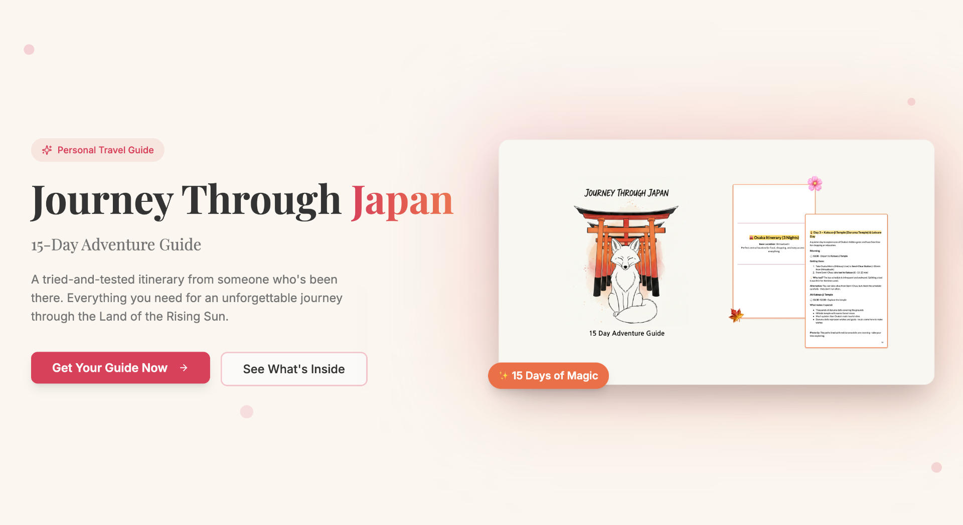 A travel guide born from my own 15-day trip across Japan — from Osaka to Kyoto, Kanazawa and Tokyo. A website to promote and sell the digital guide on Gumroad.